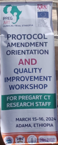 The PREGART clinical trial project conducted an amended protocol popularization workshop from March 15–16, 2024. The PREGART Project Office in Ethiopia organized the workshop to clarify some amendments approved by the regulatory bodies for implementation. Twenty-six participants (health professionals participating in the trial at the study hospitals and focal persons from regional health bureaus) participated in the workshop. The main issues discussed included the dropping of the EFV 600 arm, the no-cost extension of the trial for an additional 18 months, inclusion and exclusion criteria, informed consent, and clinical and laboratory schedules. Moreover, CRF completion and data quality management, including problems identified during monitoring of the trial, were discussed.