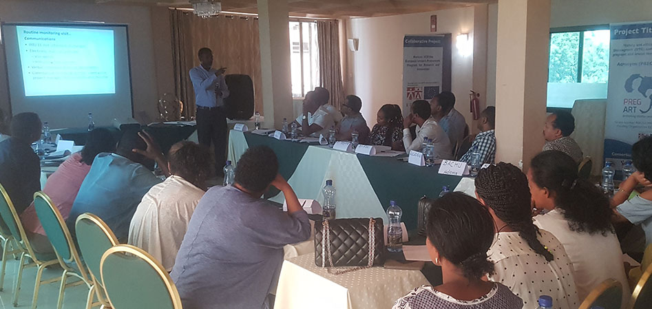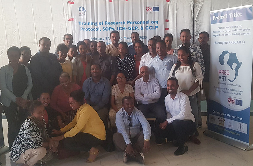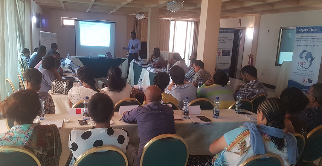 PREGART Project has conducted the first round training on Good clinical Practice (GCP), Good clinical Laboratory Practice (GCLP) and Protocol familiarization for research staff from different PREGART trial sites in Ethiopia from February 28 to March 02, 2020 at Bishoftu, 45 kilometres south of Addis Ababa. Thirty-five trainees including obstetricians/gynecologists, pediatrician, clinical nurses, laboratory technologists, pharmacists, adherence supporters, project coordinators and data manager participated in this training. At the end of the training, selected trainees with different responsibilities in the clinical trial demonstrated the clinical flow of the trial as a role-play. Trained HIV positive adherence support mothers were involved as trial participants in this role-play. The activity plan and other issues relevant for the successful implementation of the project has also been discussed.